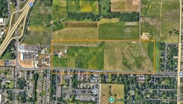 East of the Fayetteville Police Station, north of the recently improved Deane Street and East-West Alternate Transportation (Trail) corridor.